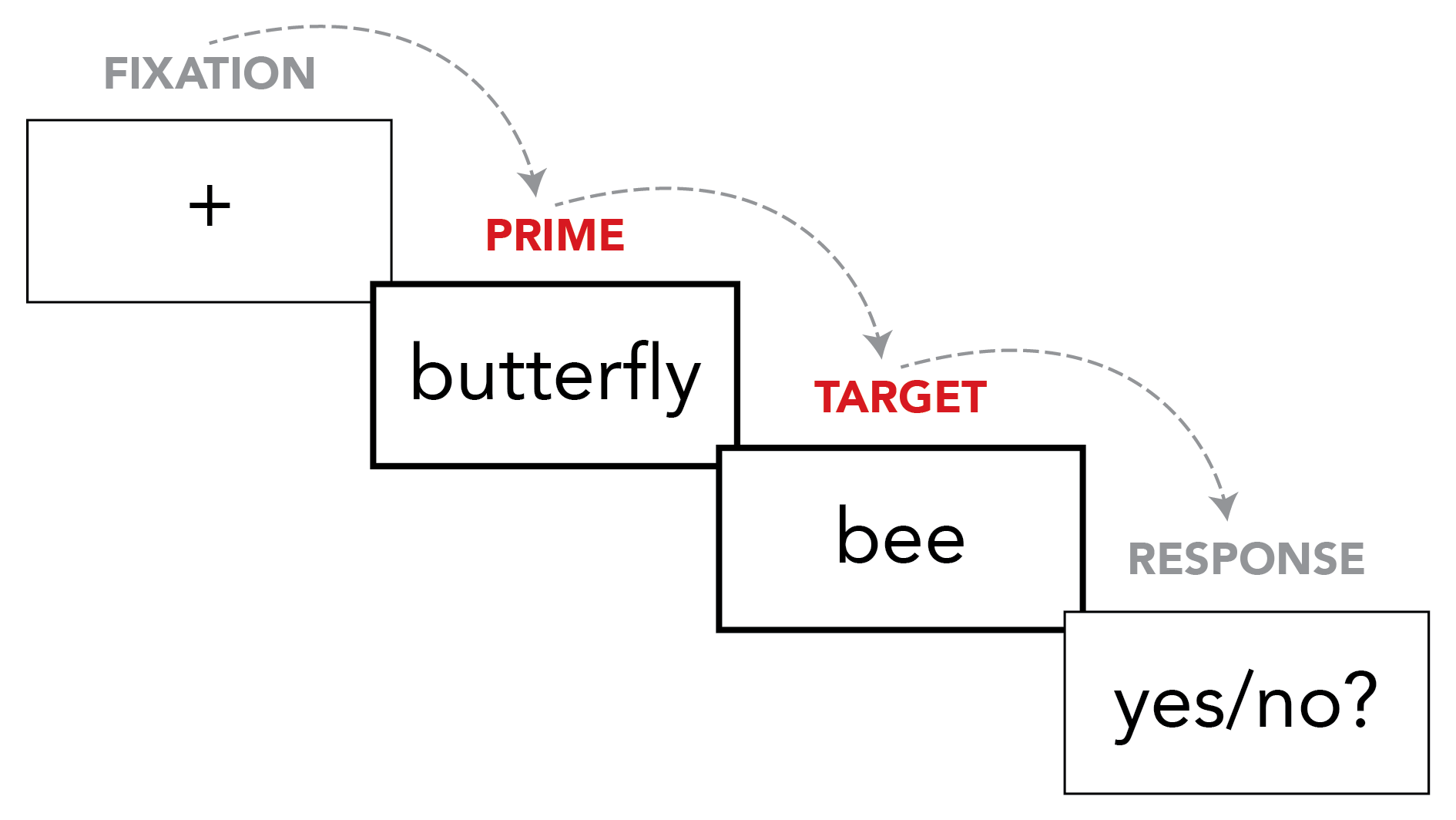 When we talk about priming experiments, we call the first word in the pair (e.g., BUTTERFLY or EDIT) the prime, and the second word (the word that the participant has to respond to by pressing a button) the target. So, for example, when someone in the experiment sees BUTTERFLY and then BEE, we would say they saw the target "BEE" with a related prime. When someone in the experiment sees EDIT and BEE, we would say they saw the target "BEE" with an unrelated prime.